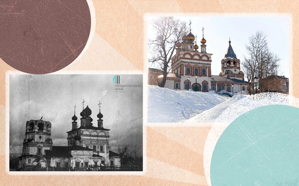 А это Богоявленская церковь в Соликамске, которую много раз ремонтировали после пожаров. В годы, когда сделана фотография, часть колокольни была разобрана для облегчения: из-за большого веса происходила просадка грунта. Ниже — как она выглядела тогда и сейчас.