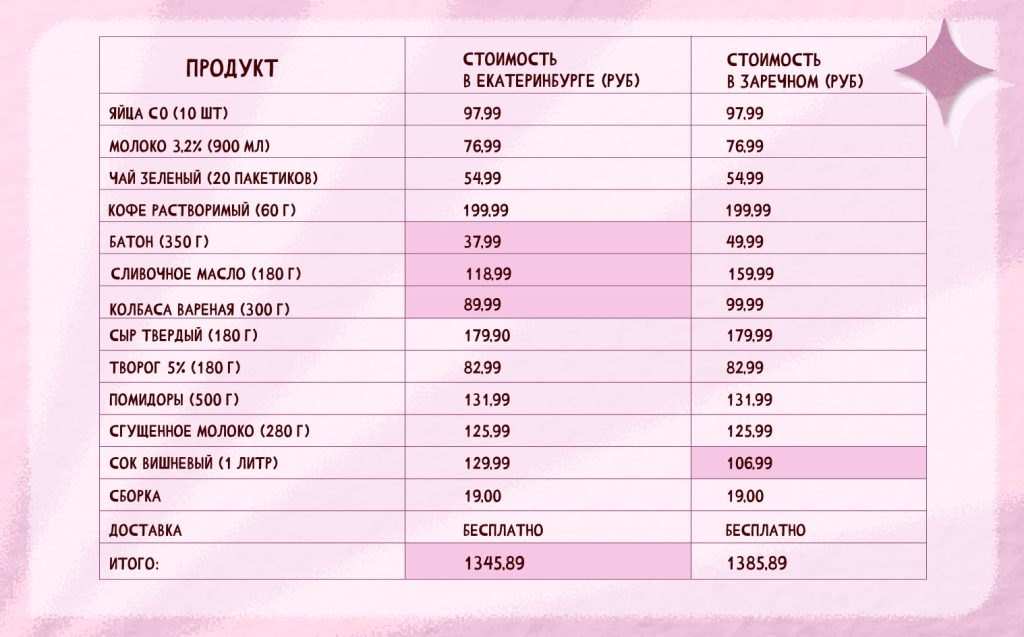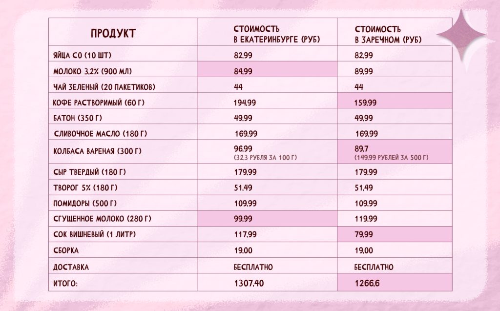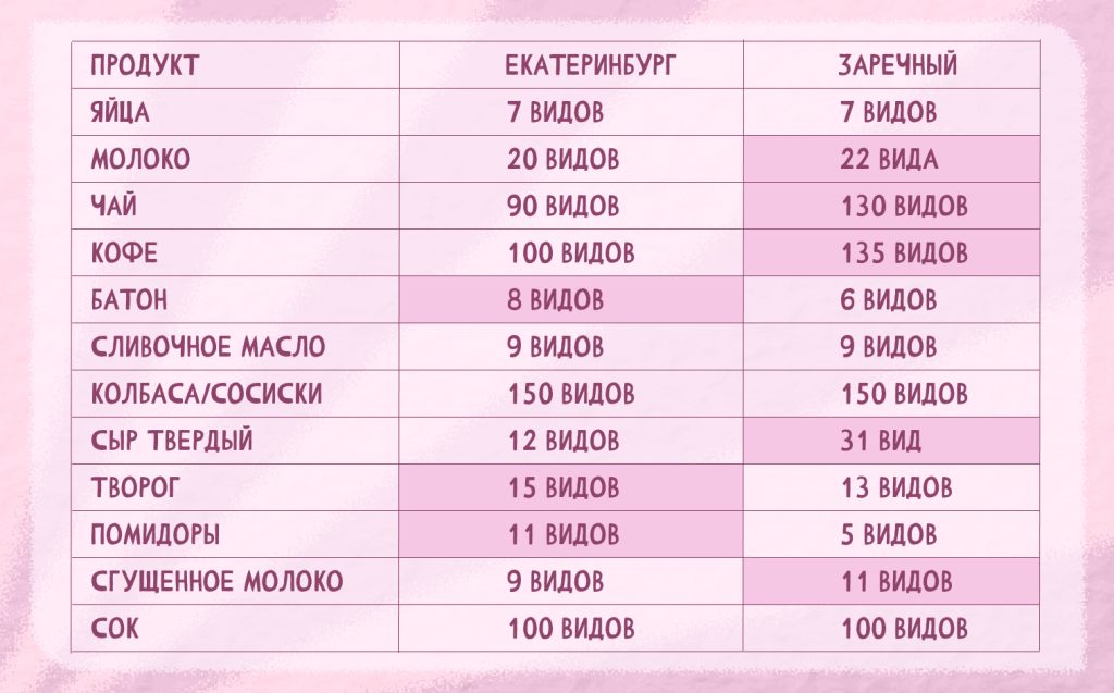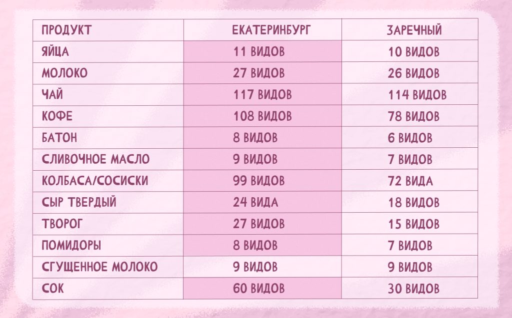 Татьяна сравнила ассортимент на доставку в Екатеринбурге и в Заречном.