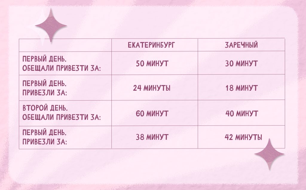 Татьяна заказала доставку в Заречном и в Екатеринбурге по два раза в разные дни. Вот какие получились результаты.