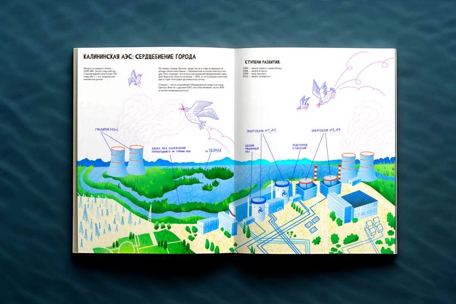 Книга «Вместе по Удомле» — результат путешествия по атомграду. Ее идея состоит в том, чтобы показать город через три ключевые стихии — воду, землю и энергию. Удомля неразрывно связана с водой: вокруг города раскинулись реки и озера. Земля здесь — природа, местная флора, редкие растения. Энергия же — сердце города, связанное с Калининской атомной станцией, одним из главных предприятий региона.