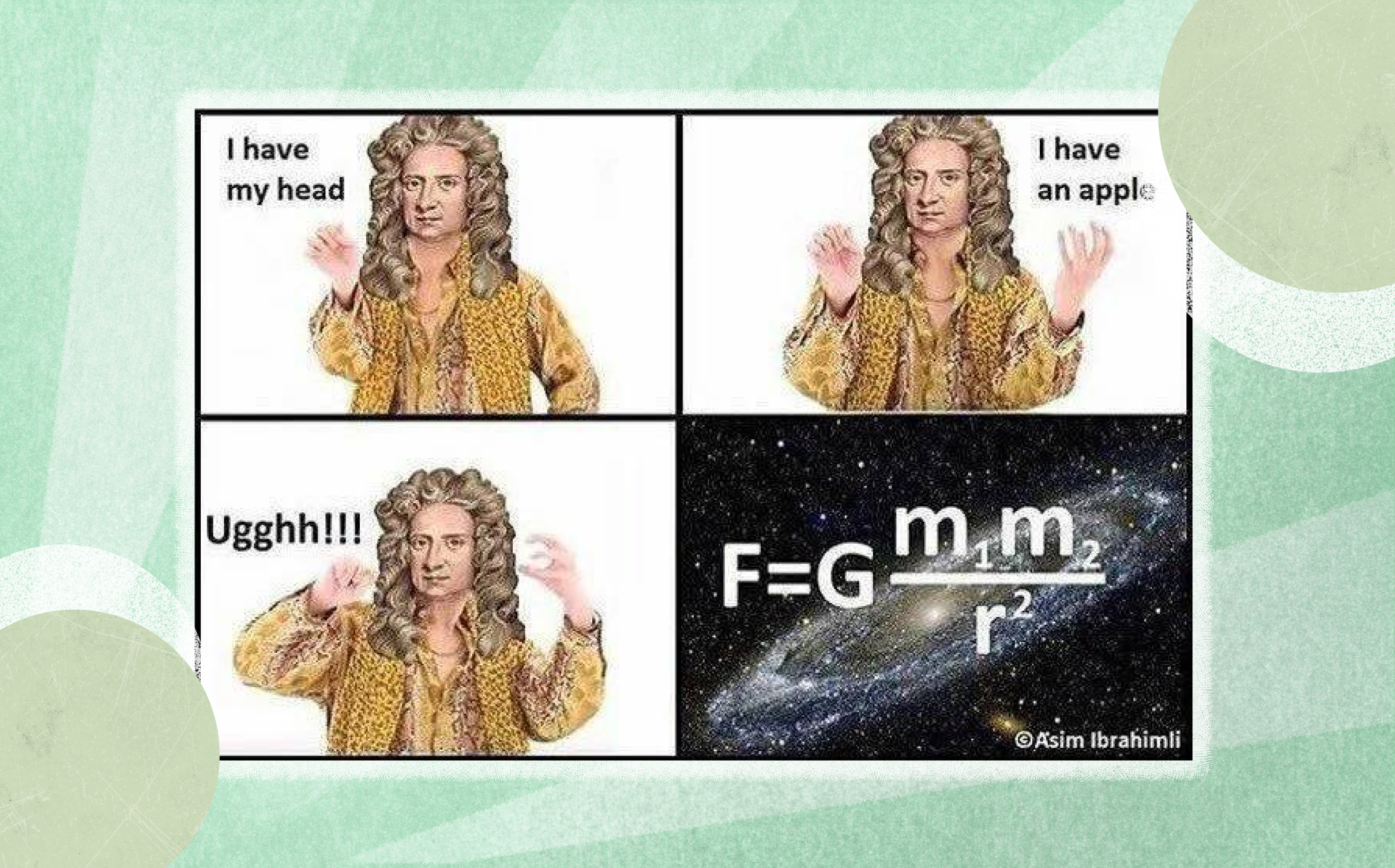 В меме также упоминается легенда про яблоко. Согласно ей, Исаак Ньютон — ученый, изображенный на картинке, — открыл закон всемирного тяготения. Он увидел, как падает яблоко с дерева, и понял, что его тянет вниз не просто так, а под влиянием какой-то силы.