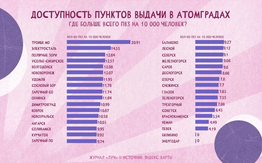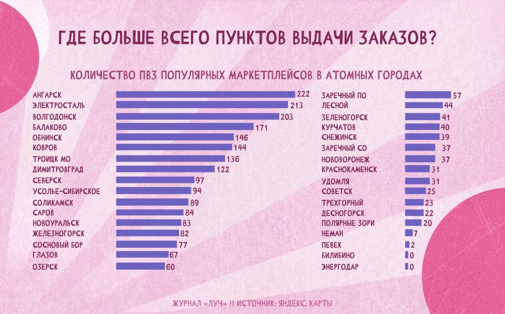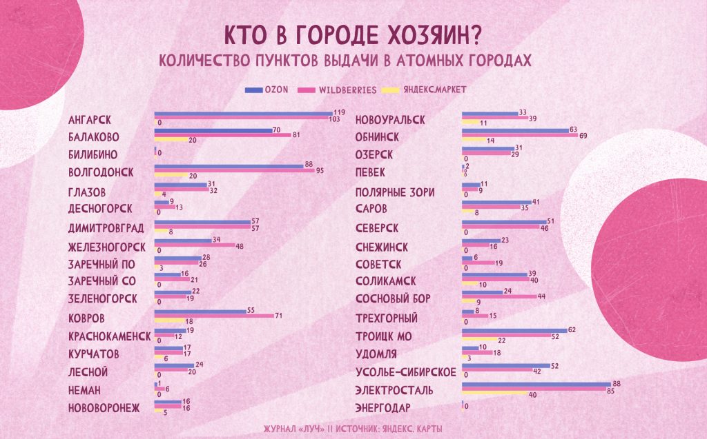 Мы посчитали количество пунктов выдачи заказов трех маркетплейсов — Ozon, Wildberries и «Яндекс Маркет» — во всех атомных городах. Получился такой топ городов по количеству пунктов выдачи.