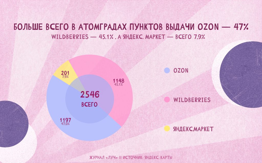 По итогам исследования выяснилось, что в атомградах чаще всего встречаются ПВЗ Ozon — 1197 пунктов (47%). На втором месте Wildberries (45,1%) с 1148 пунктами, а на третьем — «Яндекс Маркет» с 201 пунктом выдачи заказов (7,9%).