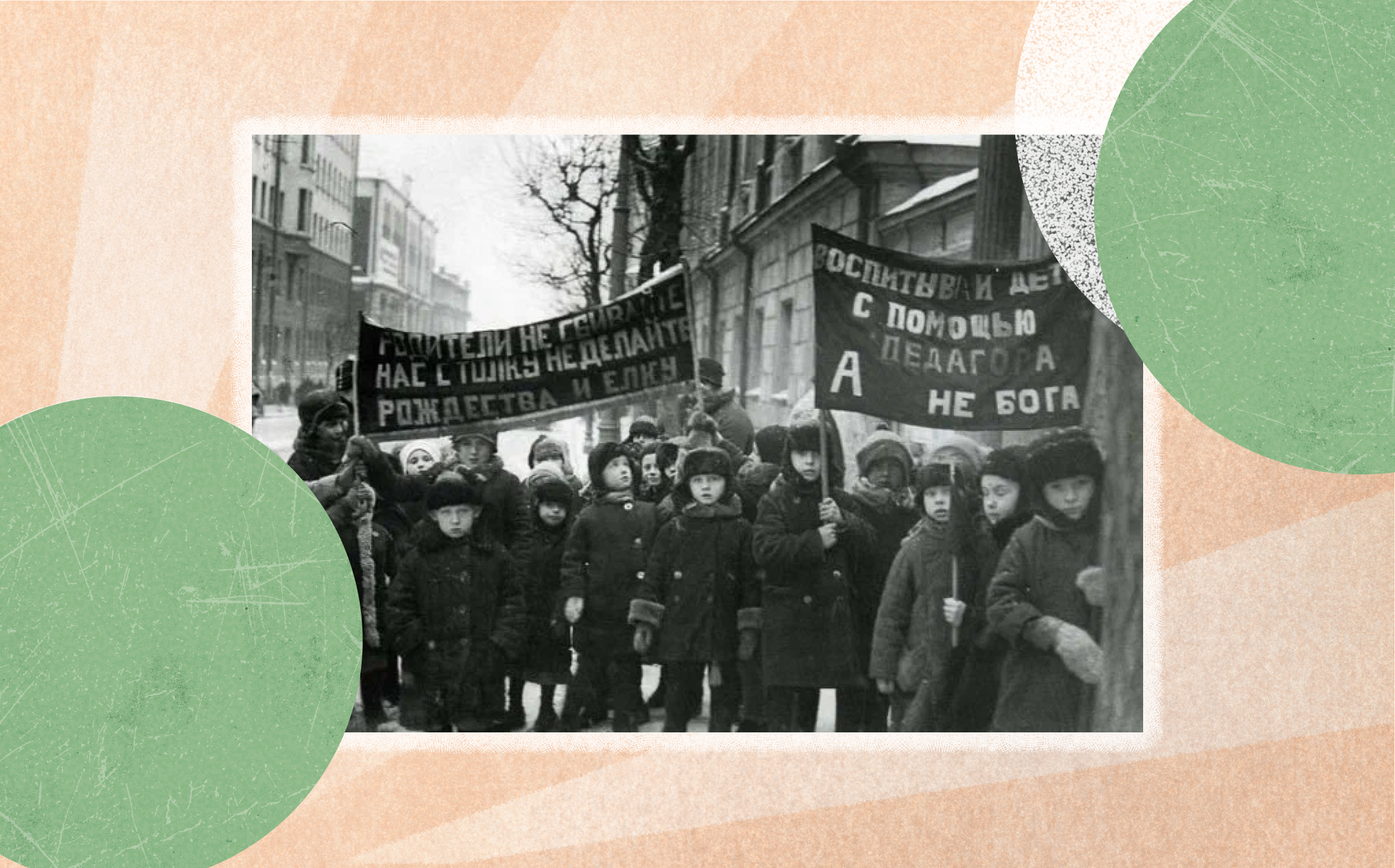 Новый год и Рождество всегда были тесно связаны и отмечали их следом друг за другом. Но так продолжалось до 1917 года, когда к власти пришли большевики. После революции люди продолжали праздновать Рождество, но руководство страны эту «религиозную традицию» поддерживать не собиралось, поэтому стало проводиться «комсомольское Рождество»: читали антирелигиозные лекции, устраивали демонстрации с красными флагами и атеистическими лозунгами. В 1929 году власти и вовсе запретили праздновать Рождество и ставить елки, а дни празднования объявили рабочими. Так оба праздника оказались под запретом.