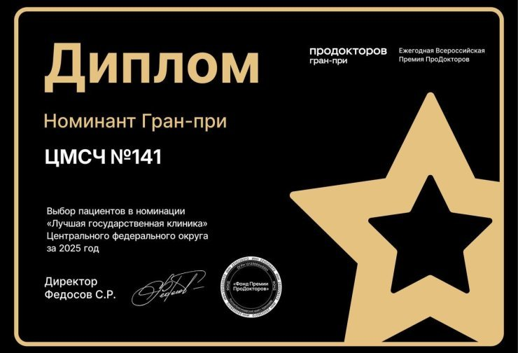 По итогам 2025 года ЦМСЧ №141 стала лучшей государственной клиникой Центрального федерального округа. Это сильный результат. Он подтверждает высокий уровень обслуживания и большую работу команды. Пациенты поставили учреждению самые высокие оценки. Они отметили внимание, точность диагностики, современный подход и уважение к каждому человеку.