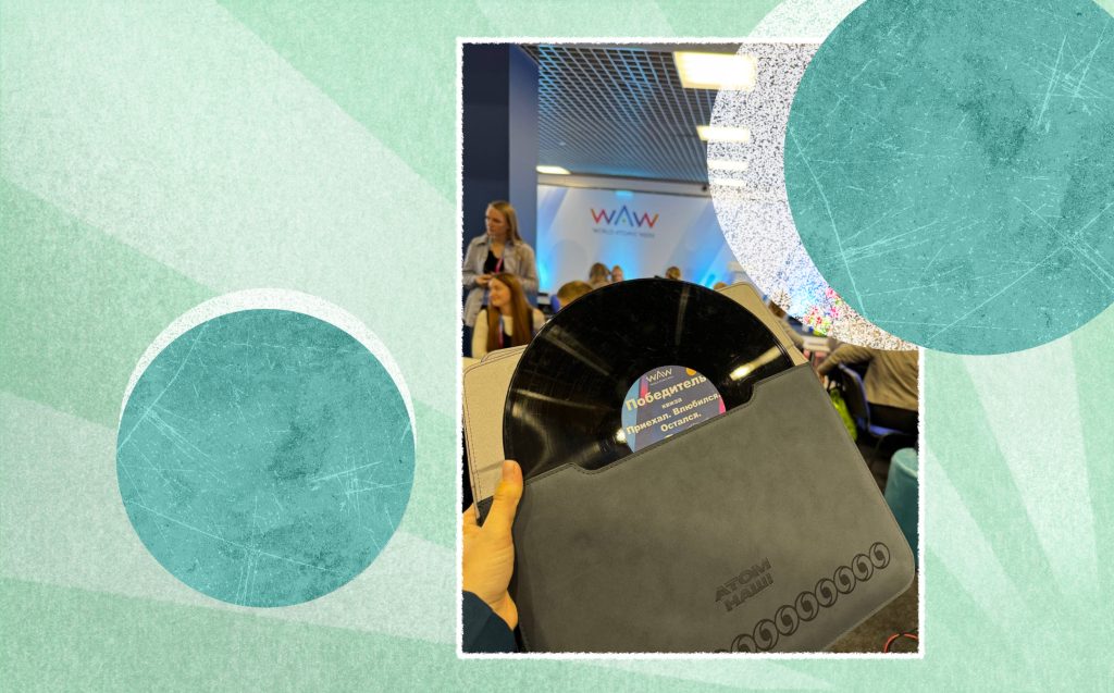 Пока участники квиза угадывают, как расшифровывается ЗАТО и что за песня звучит в блоке о космосе (кстати, Space Oddity Дэвида Боуи), на галерке, где расположились звукооператоры и другие организаторы, заканчивается подготовка к награждению. Для этого девушка достает из большой коробки старые пластинки фирмы «Мелодия» и клеит на них наклейку WAW с названием квиза. Каждый такой арт-объект она складывает в мерчовый конверт для ноутбука — кажется, победителей квиза ждет не только почет и уважение, но и приятные подарки.